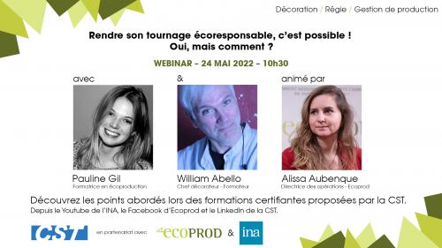 dimanche 10 mai 2020https://www.youtube.com/watch?v=Z0qYO1AZ_EU&ab_channel=INAFormationpro%2FINAsup   Le festival de Cannes et les annonces de la CST le Centre Supèrieur Technique de l'image et du son qui accueillait  ECOPROD et la mise en place avec l'INA aussi  d'un certificat de compètence a l'accompagnement aux décors éco-conçu (William Abello / Eco-Déco Ciné) ainsi que la régie /production ( Alexis Gireaudau/Eco-Régie Ciné et Pauline Gil 45 minutes de Webinaire entrevue